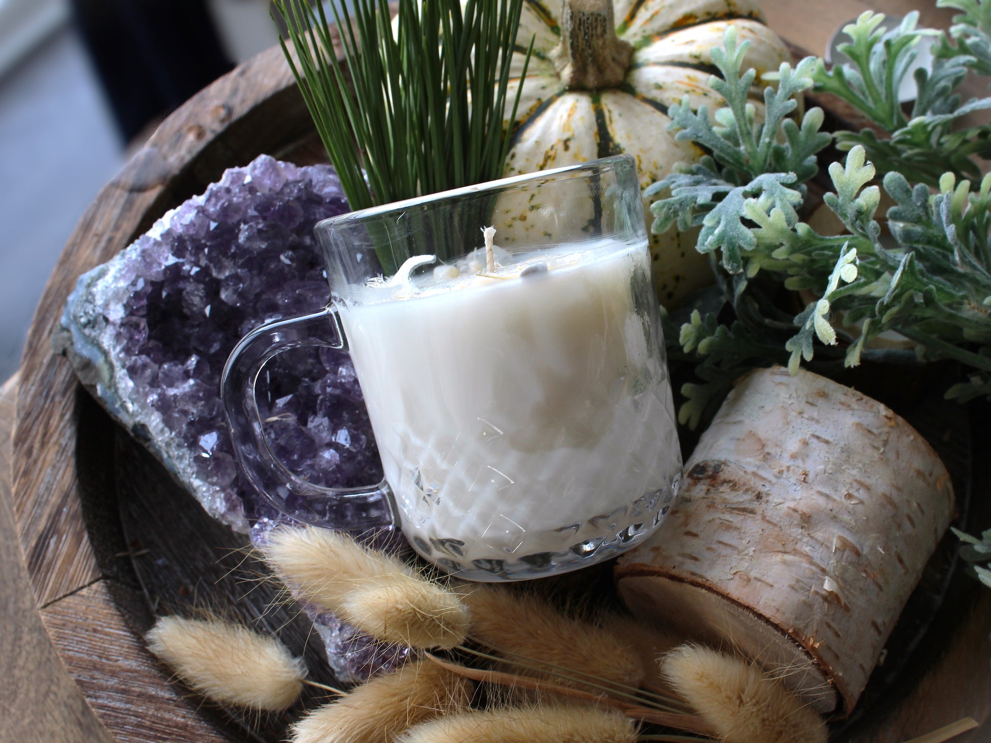 Cire de soja, fragrances sans phtalates ni parabènes, micas et colorant, herbes, fleurs, cristaux, selon les bougies éphémères.