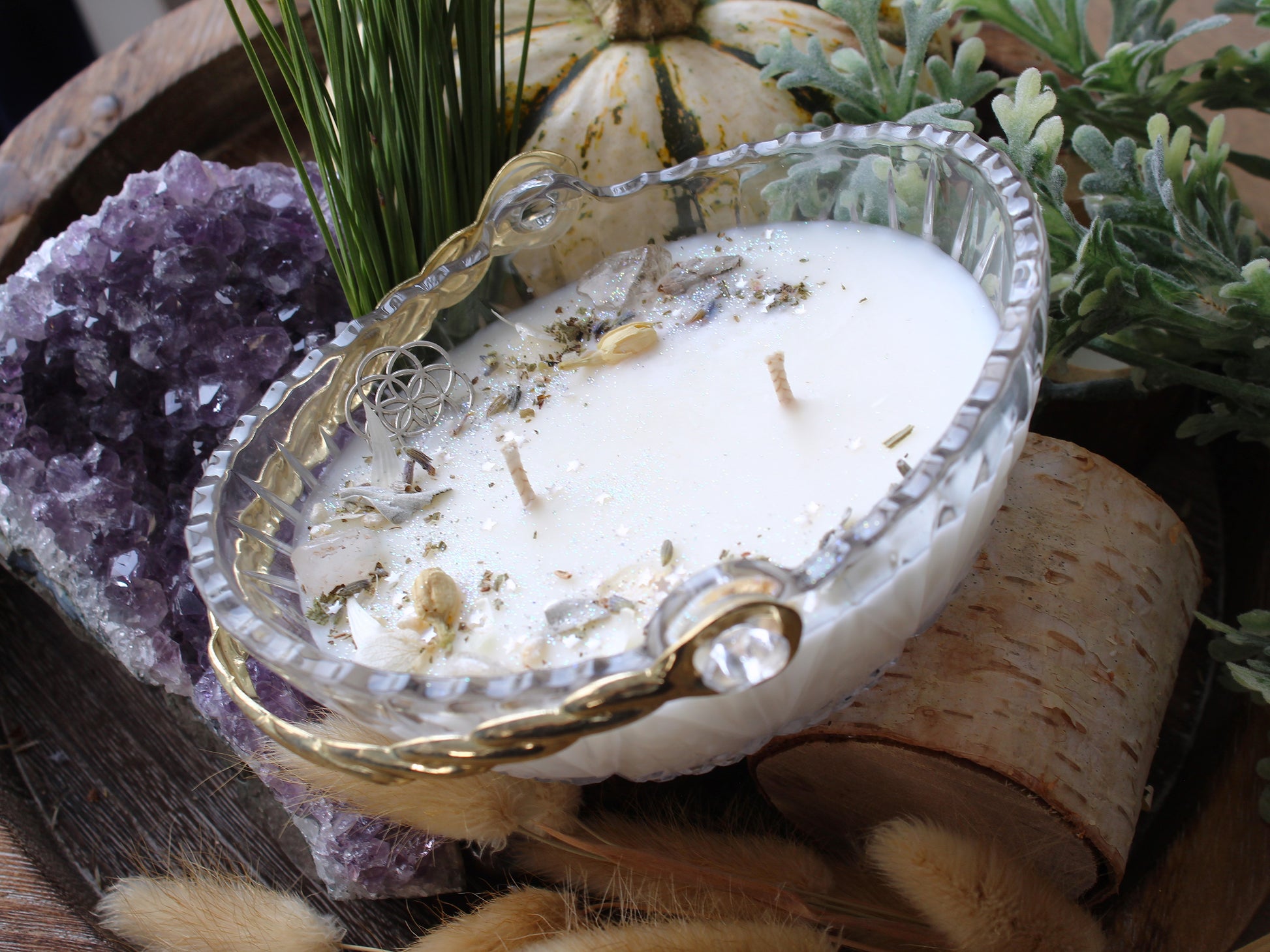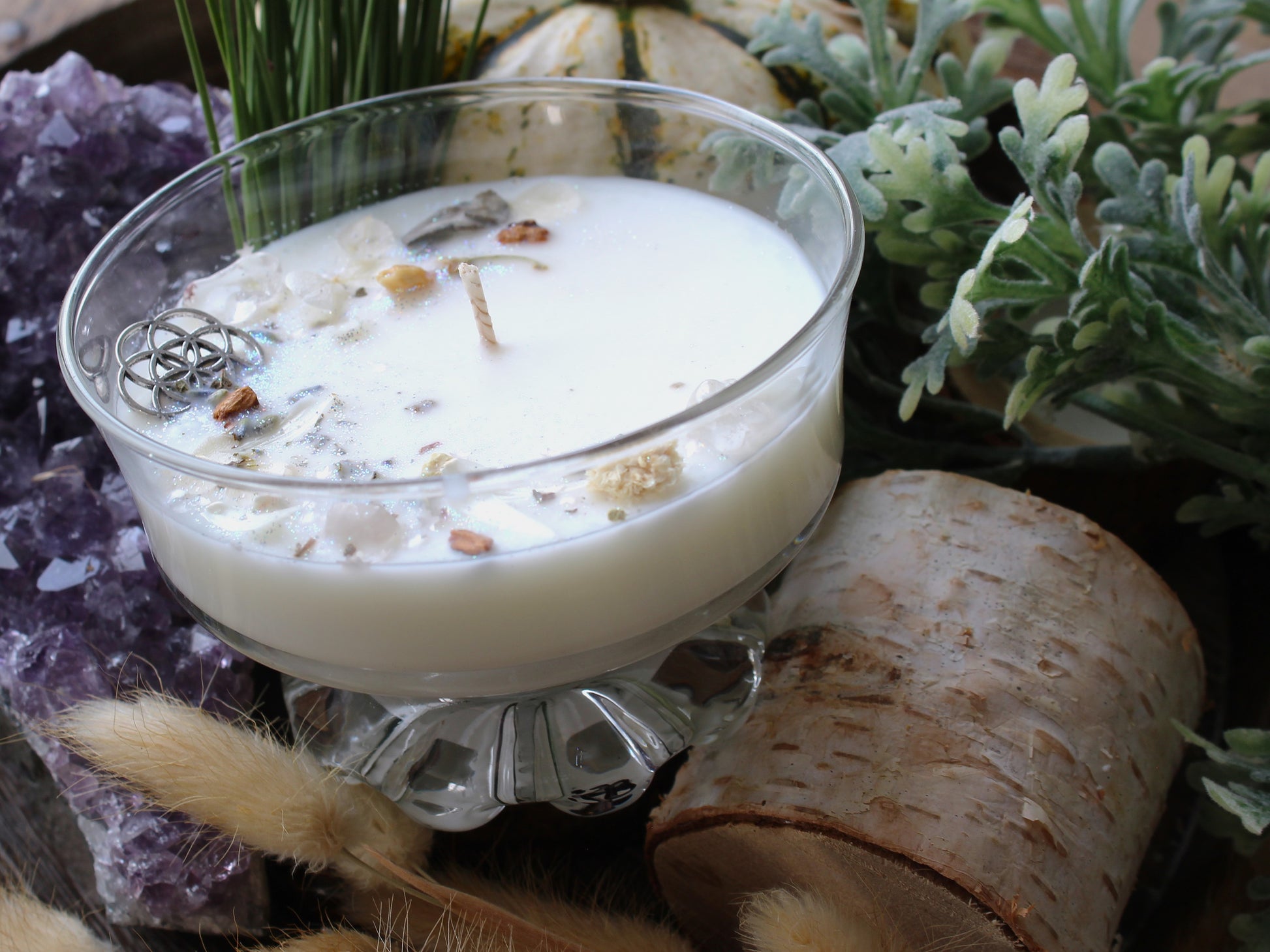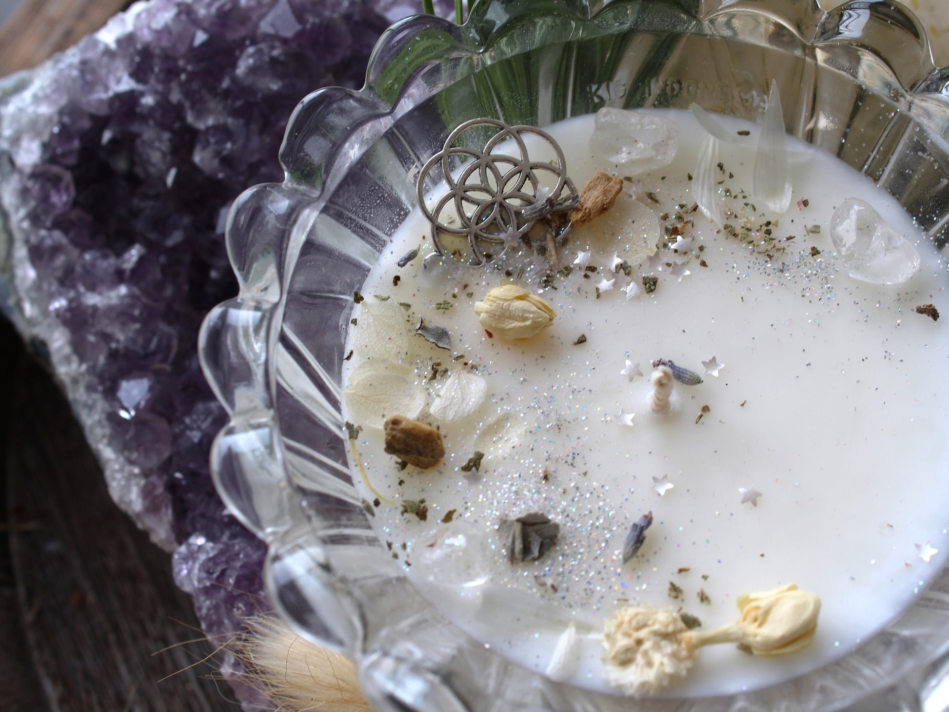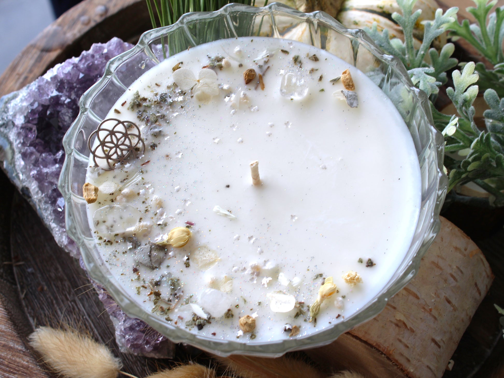 Cire de soja, fragrances sans phtalates ni parabènes, micas et colorant, herbes, fleurs, cristaux, selon les bougies éphémères.