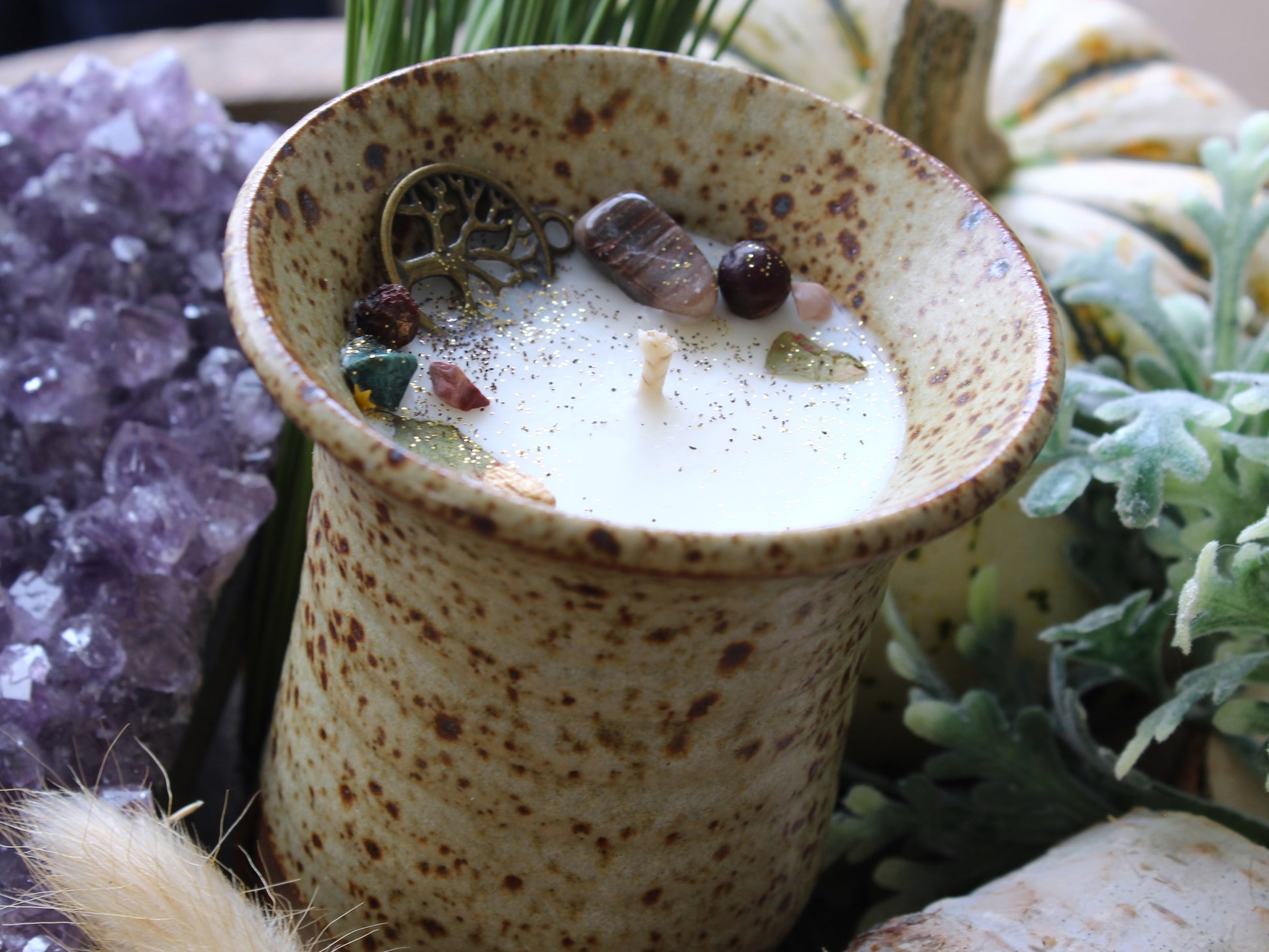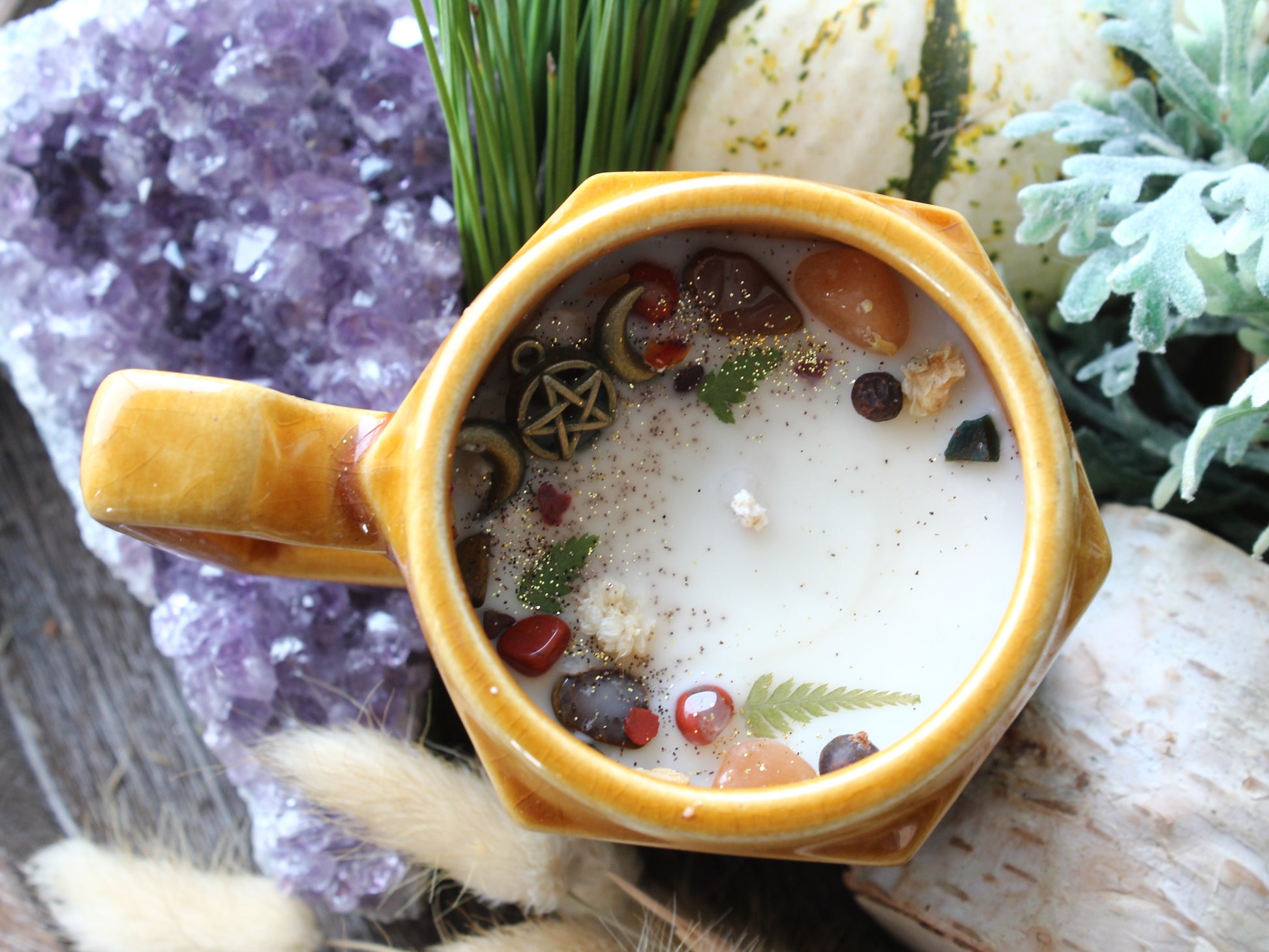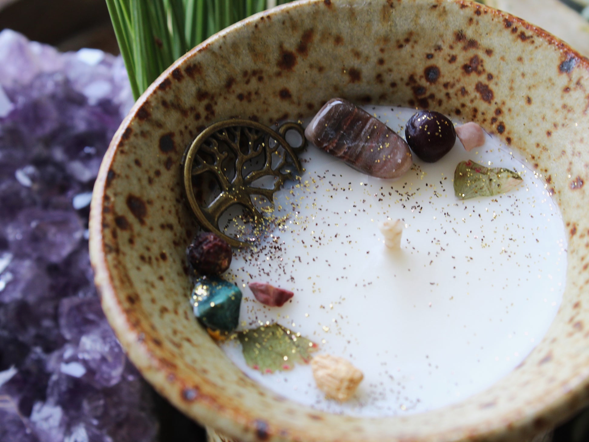Cire de soja, fragrances sans phtalates ni parabènes, micas et colorant, herbes, fleurs, cristaux, selon les bougies éphémères.