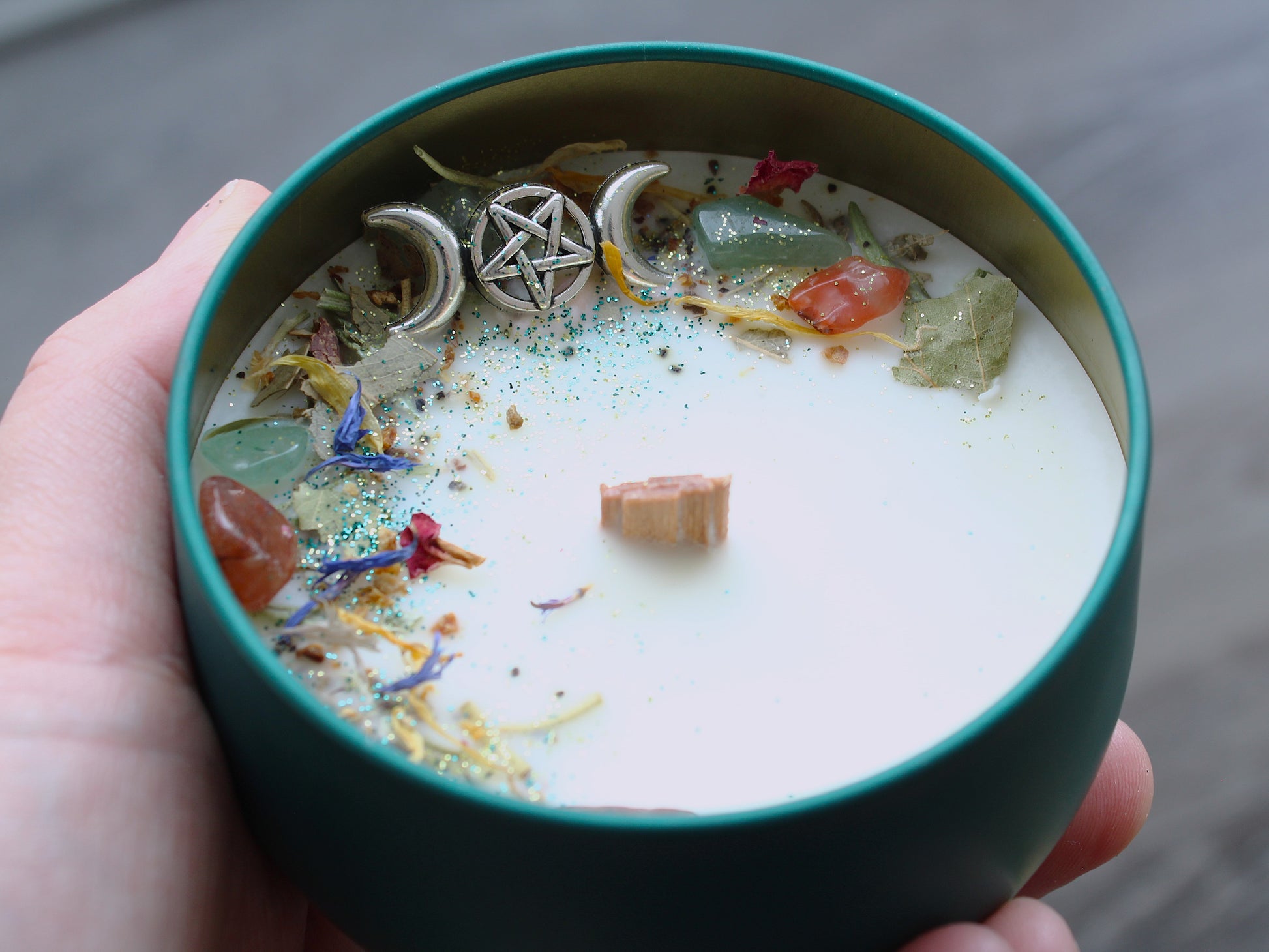 Cire de soja, fragrances sans phtalates ni parabènes, micas et colorant, herbes, fleurs, cristaux, selon les bougies éphémères.