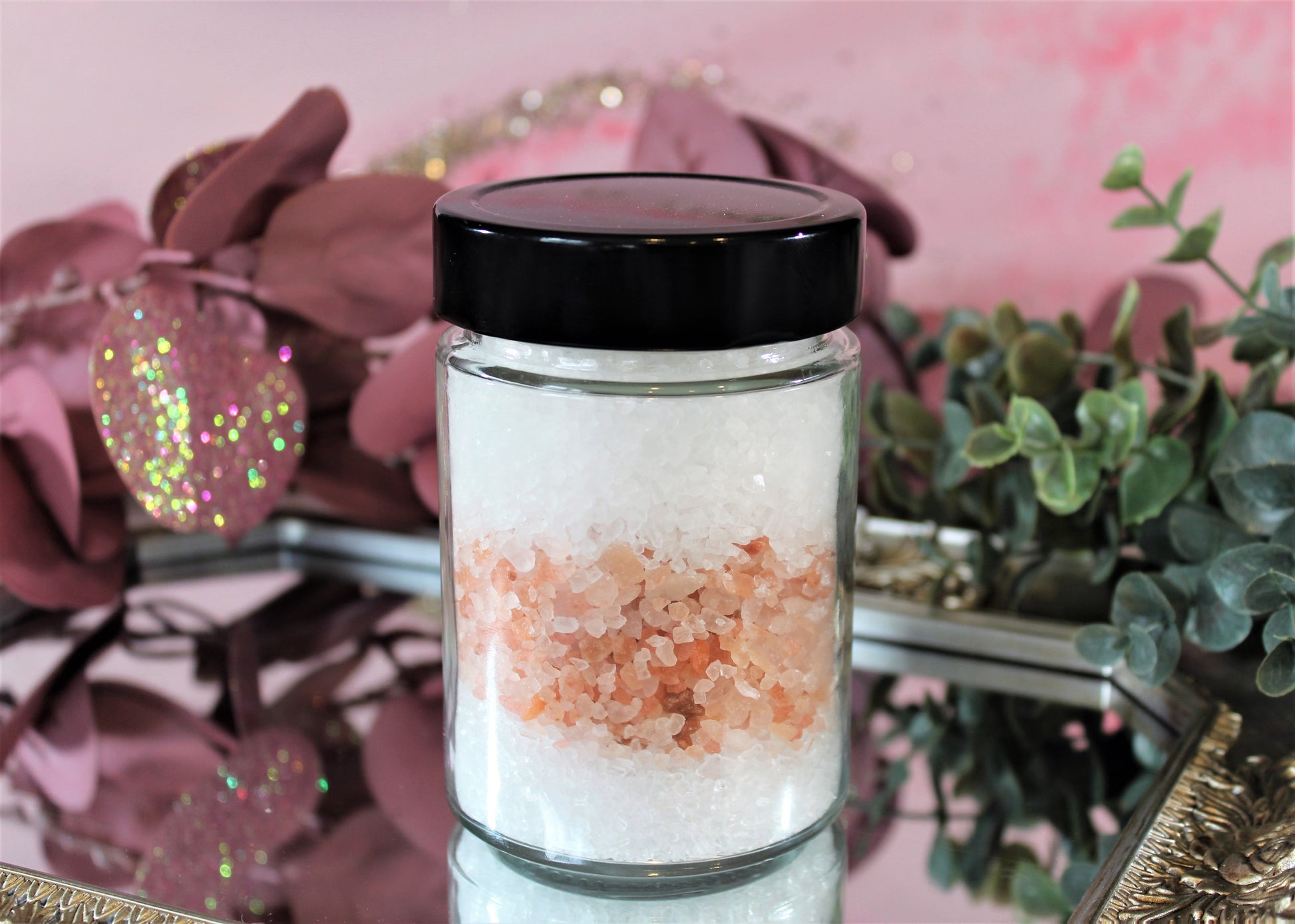Sel d’Epsom (Magnesium sulfate), Sel rose d’Himalaya (Himalayan pink salt), sel de la mer morte (dead sea salt), huile de coco (cocos nucifera oil).