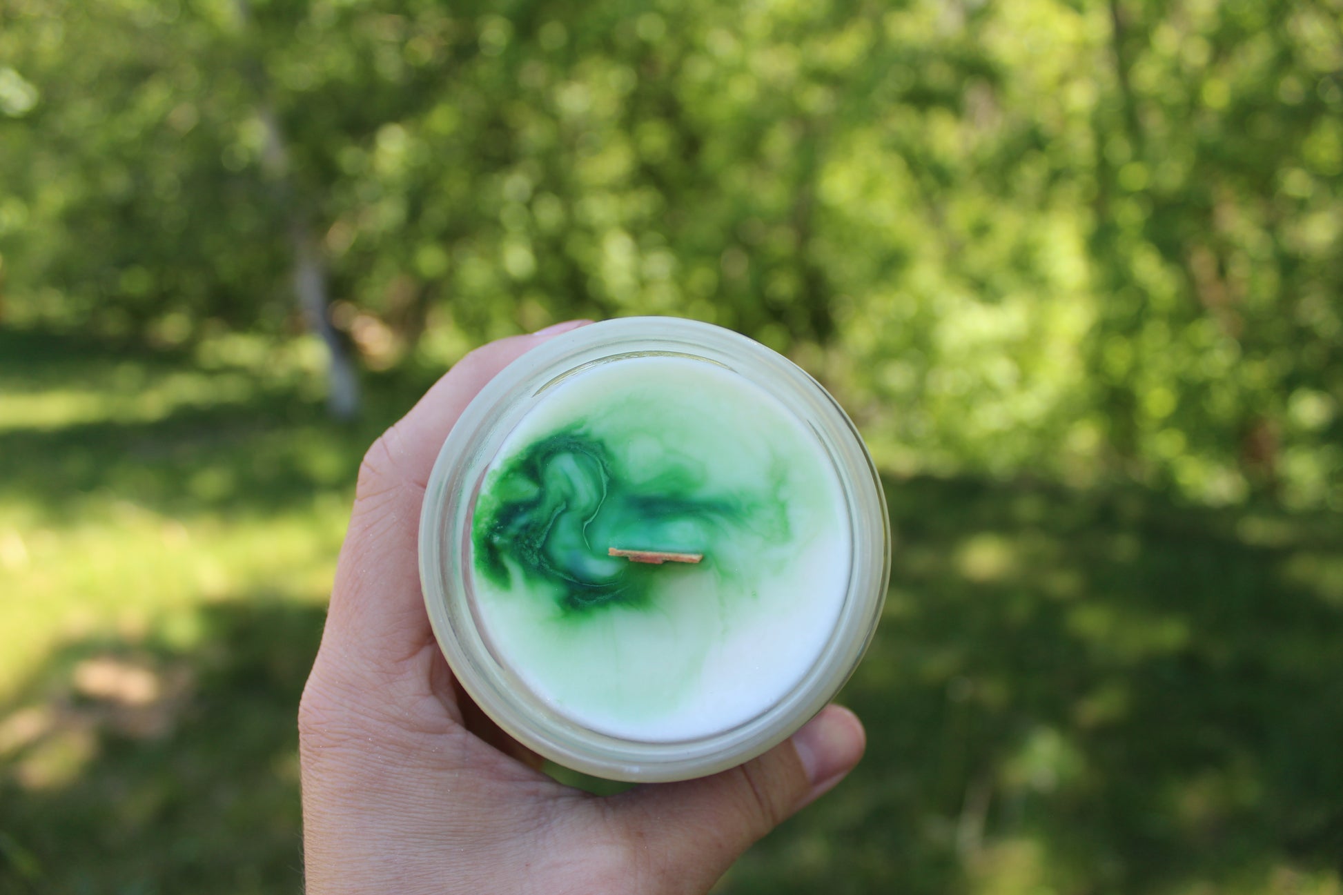 Bougie de soja avec mèche de bois crépitante à l'odeur de feu de camp.