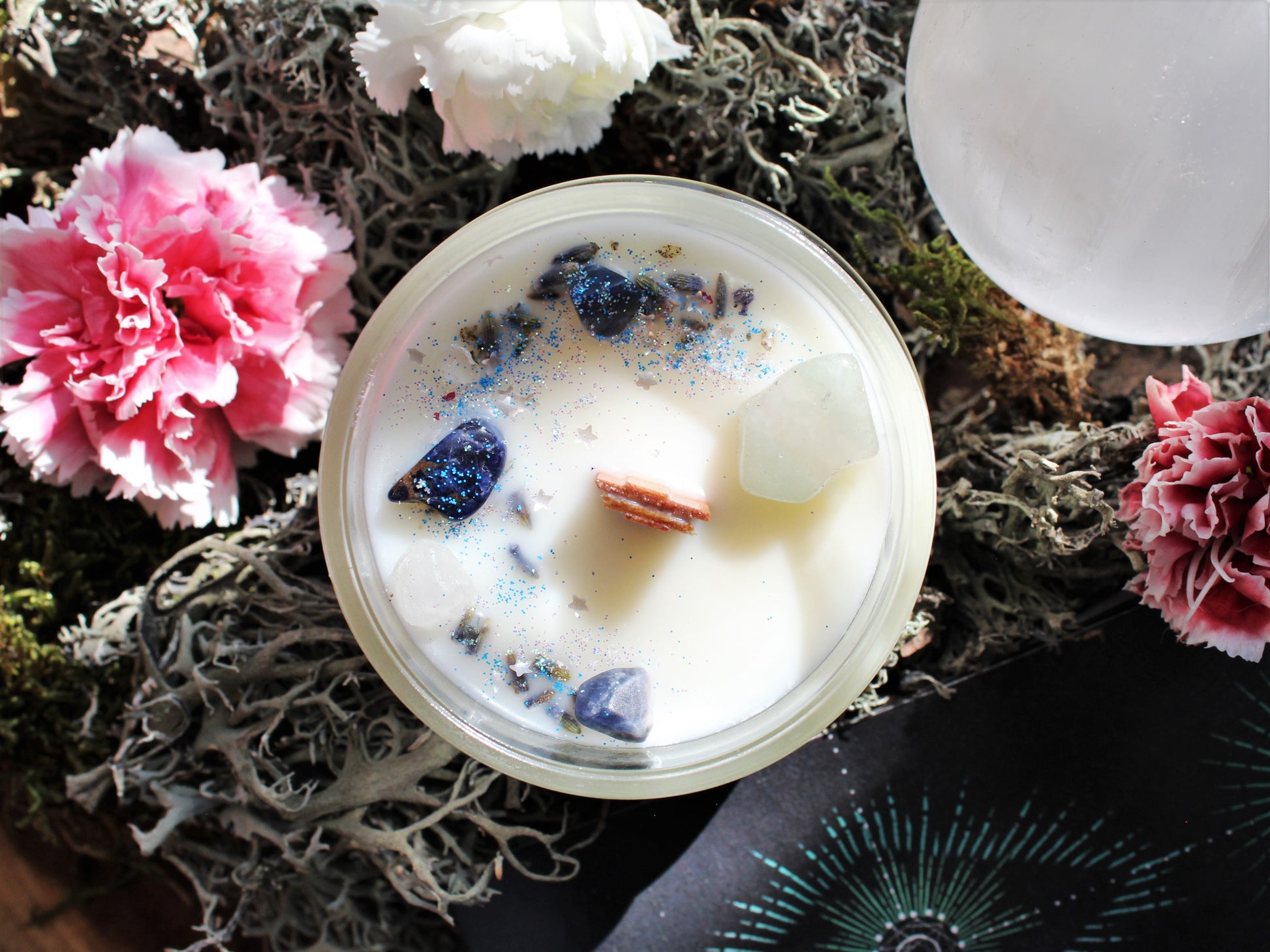 Cire de soja, fragrances sans phtalates ni parabènes, micas et colorant, lavande, lapis-lazuli, amazonite, aventurine et pierres de lune. Paillettes biodégradables.