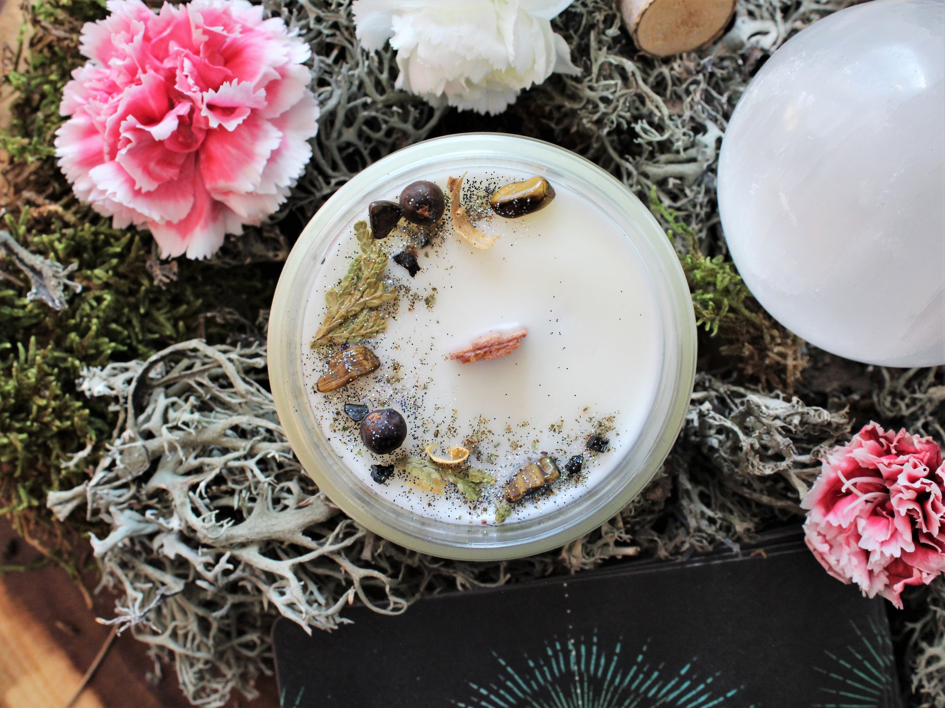 Protection, bougie de soja avec mèche de bois crépitante pour rituels