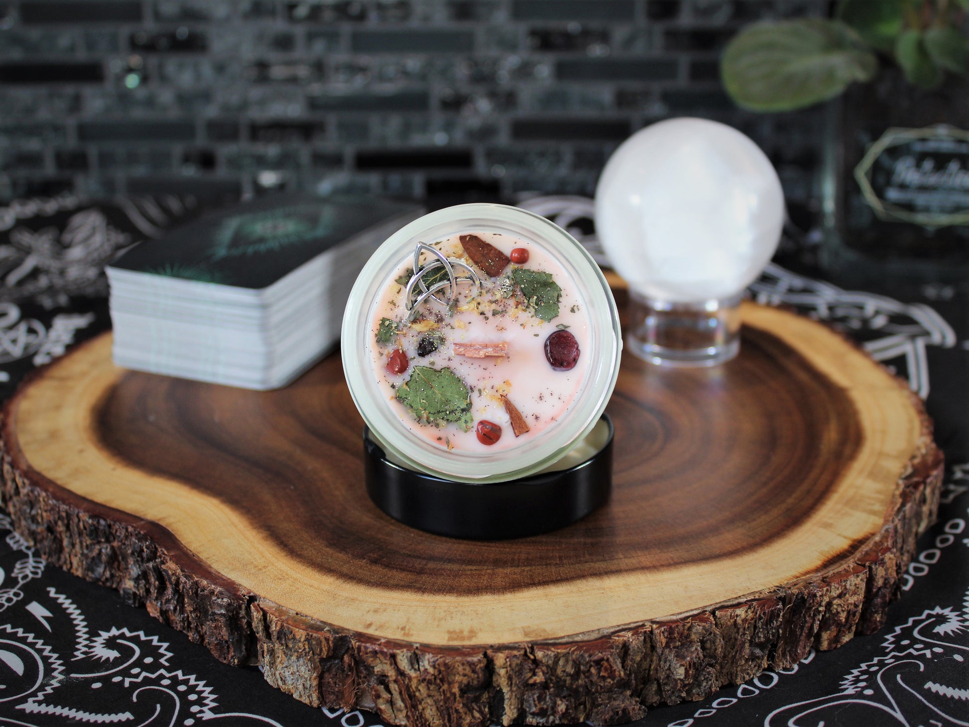 Cire de soja, fragrances sans phtalates ni parabènes, herbes et fleurs séchées, paillettes biodégradables, mika, colorant, bijou et pierres semi-précieuses.