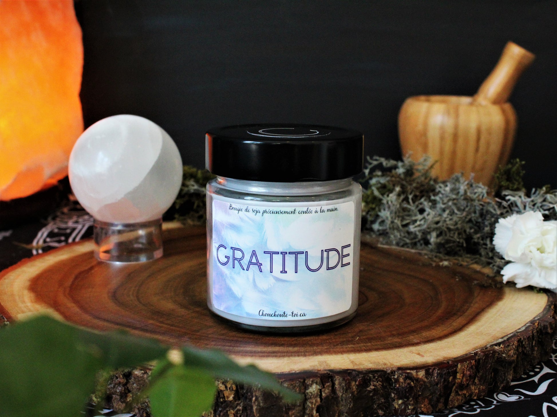Gratitude, bougie de soja avec mèche de bois crépitante.