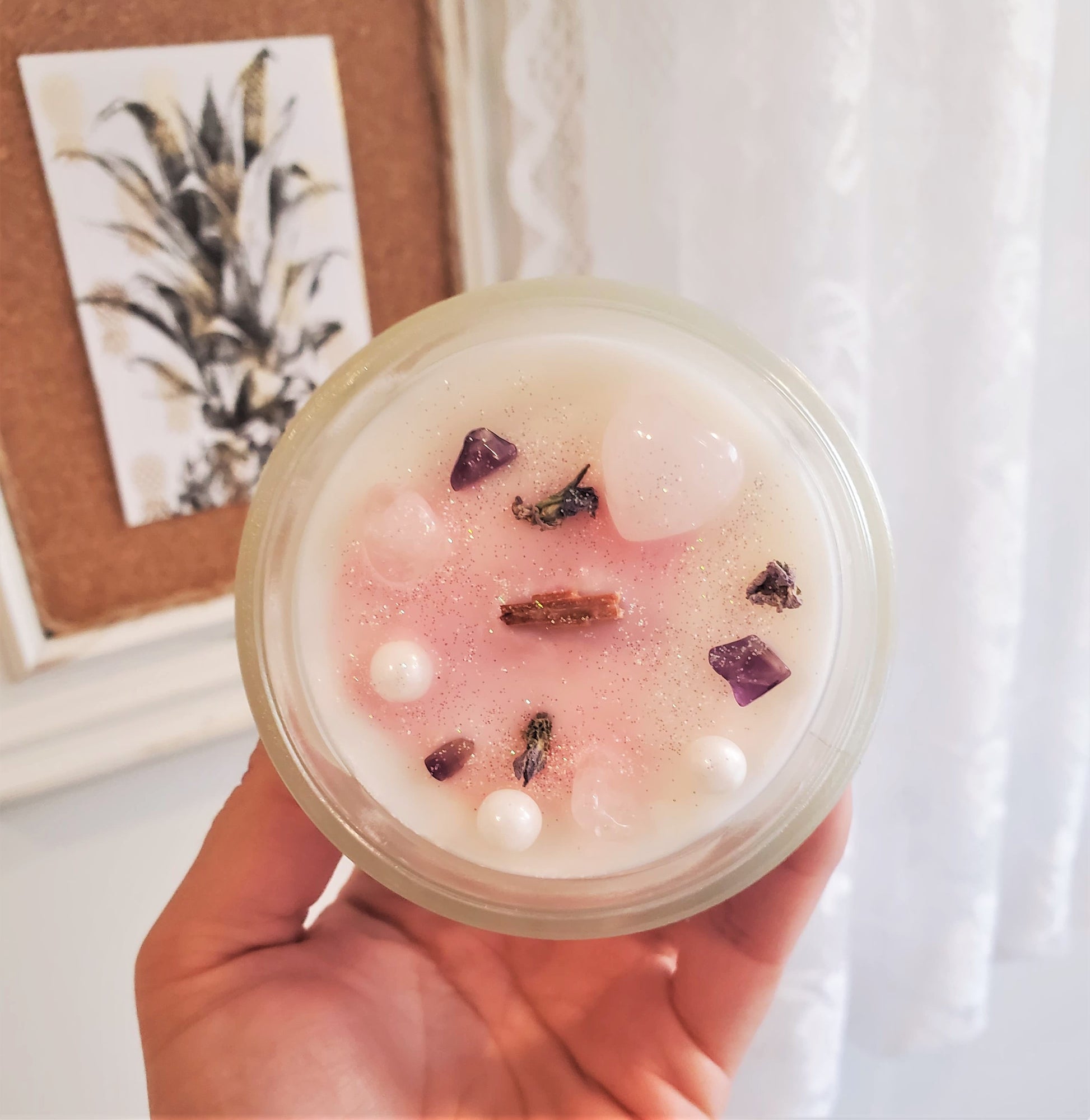 Cire de soja, fragrances sans phtalates ni parabènes, micas, paillettes biodégradables, perles de sucre et pierres semi-précieuses.